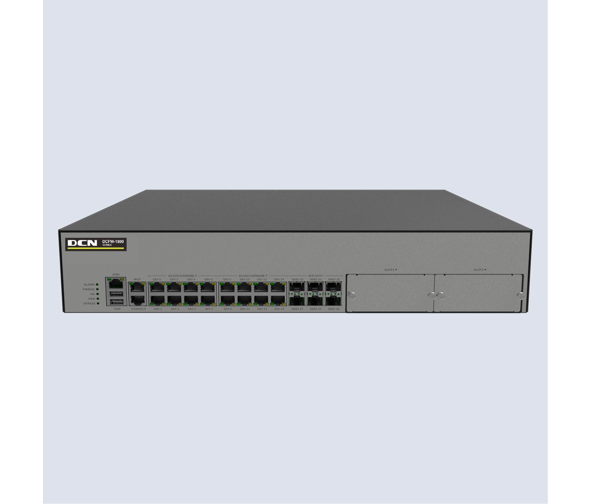 16个千兆电接口,4个千兆光接口,4个万光兆接口,2扩,2U高度,8G内存,19寸机箱,标配1T硬盘,2组bypass,标配双电源,1G带宽; 含三年质保,含1年特征库授权。 |